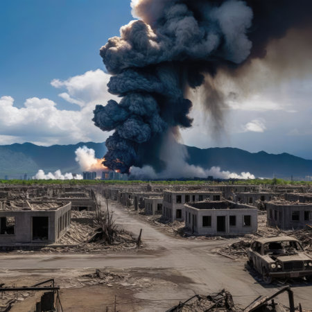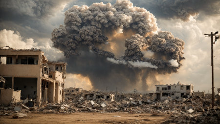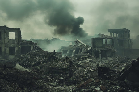 Devastated landscape with crumbled buildings and smoke-filled sky, consequences of hostilities