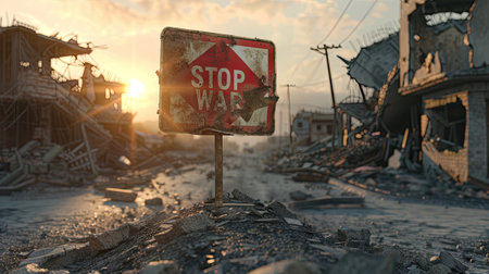 Behold the road sign 'STOP WAR' amidst destruction, a plea for humanity. Let's unite to build a world free from conflict and violence