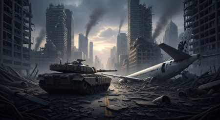 A military tank stands on a destroyed road amidst the ruins of a city, with a crashed airplane and damaged buildings under a dark, smoke-filled sky, conveying a scene of conflict and devastation.