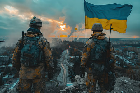 Two Ukrainian soldiers with a flag stand against a dramatic sky, representing courage, patriotism, and resilience.