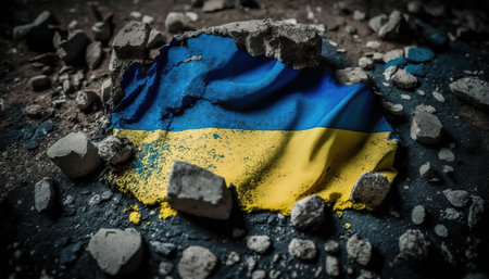 Generative AI, Ruined Ukraine banner, Ukrainian flag on broken concrete, cracked, shattered, rubble ground. no war concept