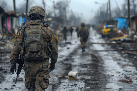 Amid the destruction of shattered buildings, soldiers traverse a desolate city, grappling with the aftermath of warfare.
