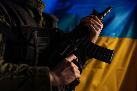 A Ukrainian soldier in military uniform holds a machine gun, the war in Ukraine and the protection of his home and family 2022