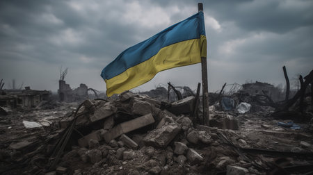 Dirty Ukrainian flag lying on devastated ground, symbolizing the devastation and consequences of war