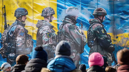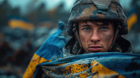 A poignant portrayal of Ukrainian soldiers with their national flag, representing their unwavering determination, homeland defense, and the strength of a nation united in conflict.
