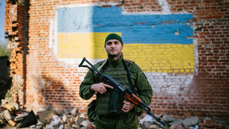 Ukrainian soldier with rifle in front of destroyed building, flag visible, portraying war s impact