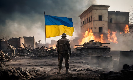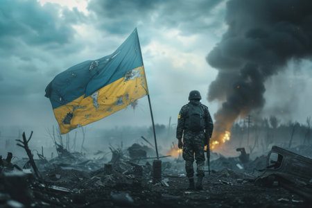 A solitary figure approaches a billowing Ukrainian flag in a war-torn landscape. The scene symbolizes unwavering courage in the face of adversity. AI generation AI generation
