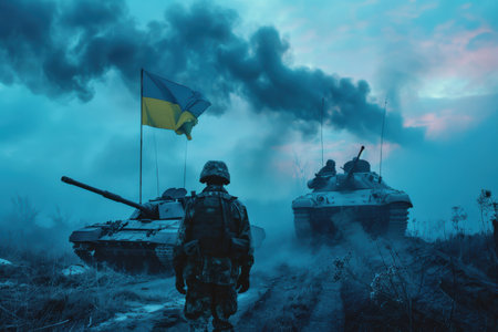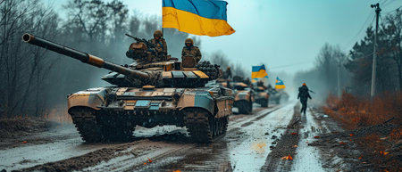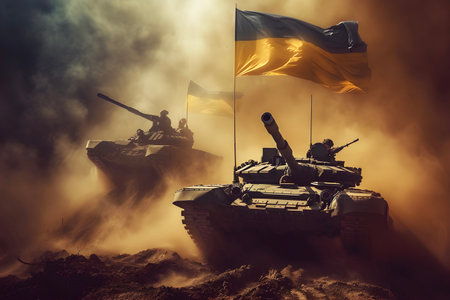 Ukraine flags and tanks, war victory concept
