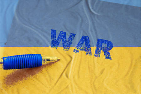 The word war on a cardboard background of the Ukrainian blue-yellow flag.