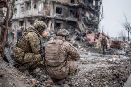 Two Ukrainian soldiers assessing the extensive destruction in a city ravaged by the ongoing war, highlighting the devastation and loss