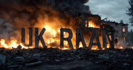 The bold letters Ukraine stand ablaze amidst the ruins, a powerful and harrowing representation of conflict and resilience.