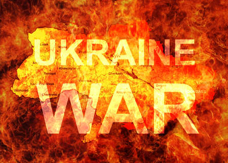 War in Ukraine concept, Russia and Ukraine conflict on burning map. Banner with Ukrainian territory on fire. Russia vs Ukraine in flame. Illustration of crisis in Europe.