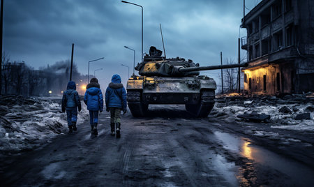 An AI generated illustration of a group of pedestrians strolling down a rural path with military tanks in the background, in an urban setting