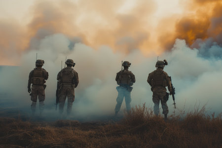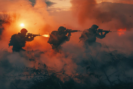 Silhouettes of military personnel engaged in combat training exercises during a dramatic sunset with smoke.