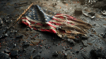 A solitary military helmet rests on a pile of debris, showcasing wear and grime. The urban background emphasizes the stark contrast between safety and destruction.