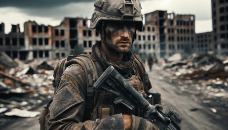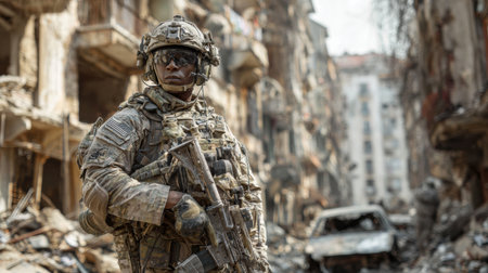 Uniformed soldier stands alert in a devastated city landscape, prepared for a mission amidst the ruins.