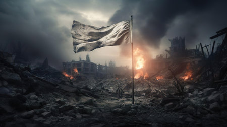 The white flag is a sign of surrender. The army surrenders with a white flag on the background of a destroyed city. Stop war and military attack.