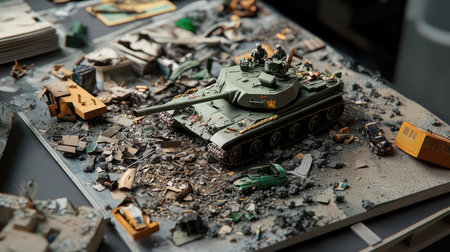 A detailed military tank model rests amidst scattered debris and wreckage in a realistic battlefield diorama. The intricate design showcases craftsmanship and artistry.