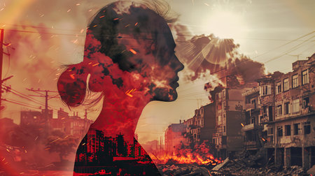 Double exposure of womans silhouette against ruined city in fire, because of war