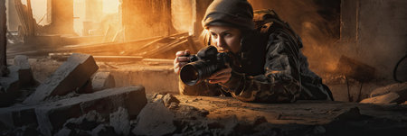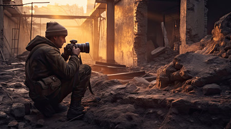 a Photographer with a camera working making a army reportage. War journalist at ruins roping in war. Generative Ai