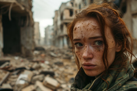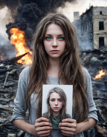 Amidst the chaos, the artist holds a self-portrait, her eyes reflecting a depth beyond her years. The simplicity of the portrait juxtaposes the complex destruction around her, symbolizing a calm inner strength.