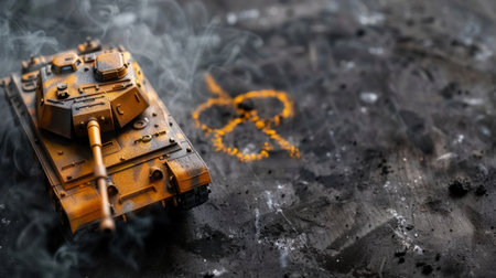 A striking close-up of a model tank showcased on a dark surface, enhanced by wisps of smoke and an artistic orange element, illustrating creativity.