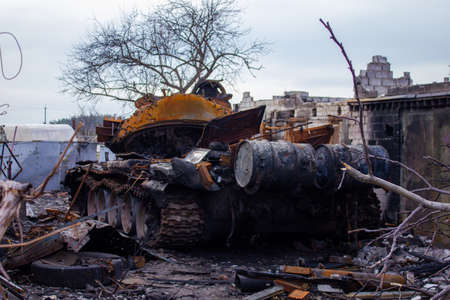 Velyka Dymerka, Kyiv region, Ukraine - April 2022: War Ukraine Russia. The ruins of the house after the bombing by the Russian army. Destroyed tank and house after a missile attack. The consequences o
