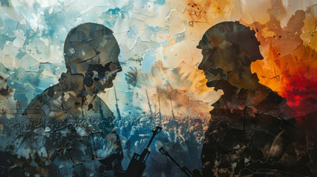 A painting depicting two soldiers standing face to face, displaying a tense and confrontational moment. The soldiers are dressed in historical military uniforms, each holding a weapon.