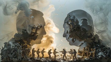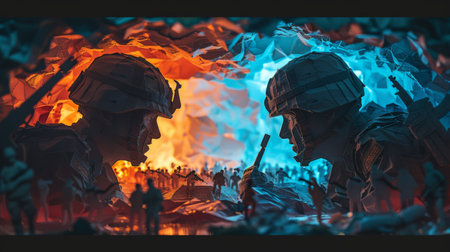 Two soldiers are depicted standing in front of a fire in a double exposure paper cutout art piece.