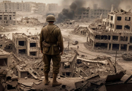 A solitary soldier stands amidst the ruins of a devastated city, surrounded by destruction and signs of a recent battle.