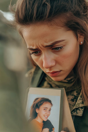 A soldier stands in a war-torn city, holding a picture of another soldier. The ruins and destruction around him reflect the devastation of conflict, while the photo symbolizes remembrance.. AI Generation