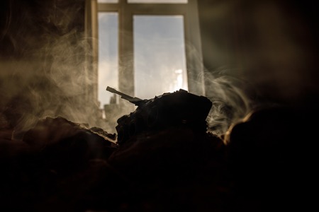 War Concept. Military silhouettes fighting scene on war fog sky background, World War Soldiers Silhouettes Below Cloudy Skyline. Armored vehicles. Tanks battle. Decoration. Selective focus