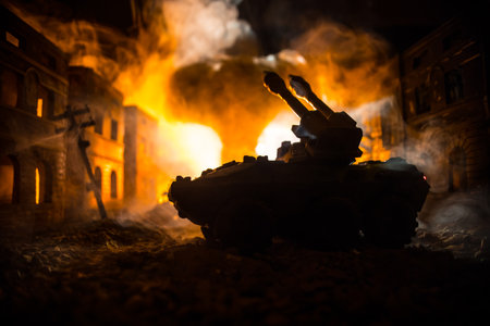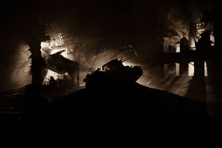 War Concept. Military silhouettes fighting scene on war fog sky background, World War Soldiers Silhouettes Below Cloudy Skyline At night. Attack scene. Armored vehicles. Tanks battle. Decoration