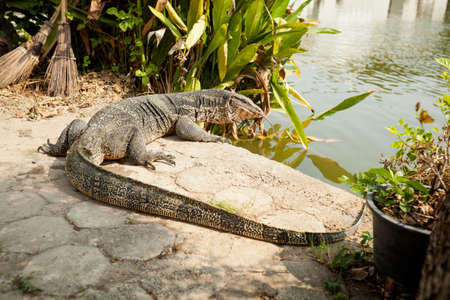 Monitor lizard on the shore of a pond in a city park in Thailand