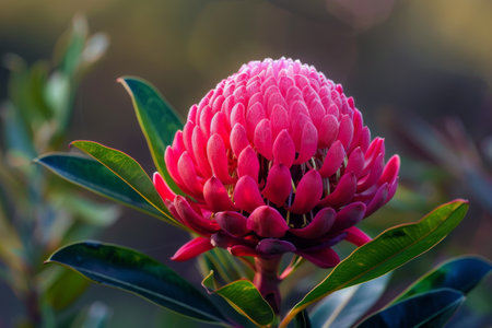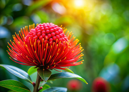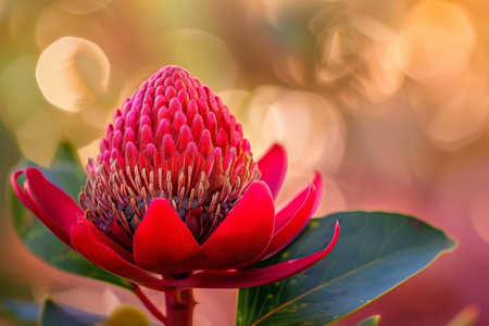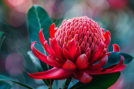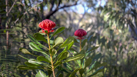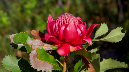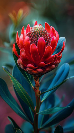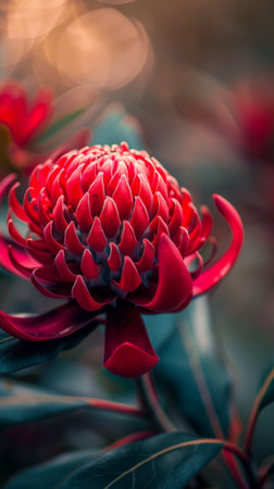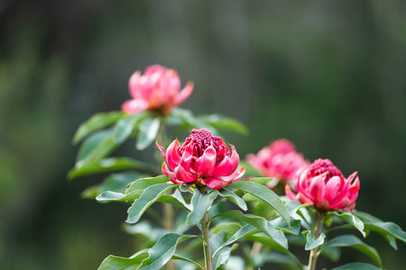 Red Waratah flower blossoming on blurred background
