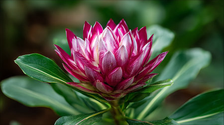 Elegant Protea flower with detailed petals and lush green leaves.