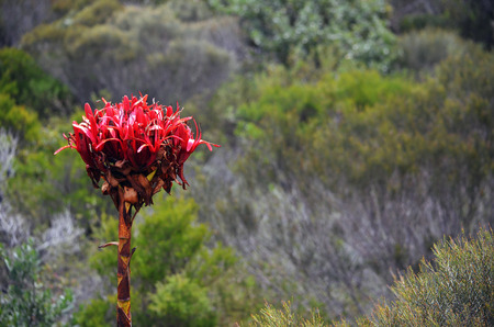 Australian native giant Gymea Lily flower spike, Doryanthes excelsa, surrounded by woodland at Wattamolla in the Royal National Park. Also known as the Flame Lily or Spear Lily. Native to east coast of New South Wales, Australia.