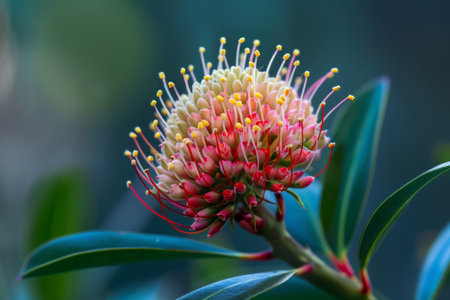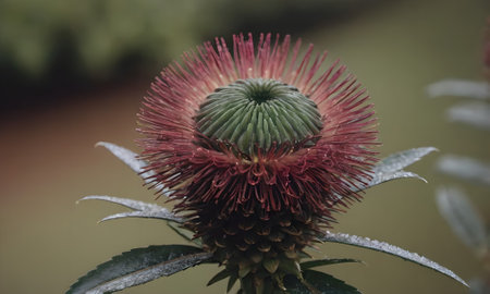 native Australian protea with red flowers outdoor with raindrops in beautiful tropical backyard shot at shallow depth of field