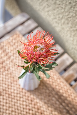 Beautiful red pincushion protea flower in a ceramic vase. Tropical plant