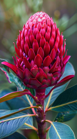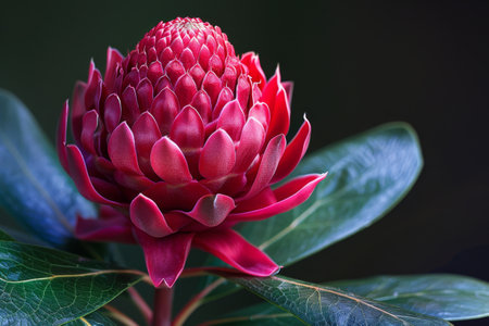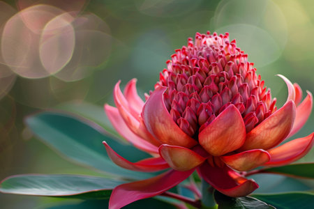 Close up of a red torch ginger flower in bloom, Australia.