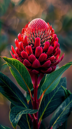 A detailed view of a vibrant red Waratah flower, showing its intricate petals and center with a blurred background adding depth to the composition.