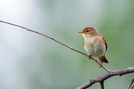 Close-up of a Willow warbler bird, Phylloscopus trochilus, singing on a beautiful summer evening with soft backlight on a vibrant background.