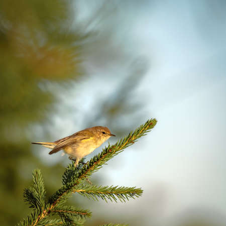 A small beautiful bird sits on a fir branch in the light of the morning sun. Phylloscopus collybita. Bird watching