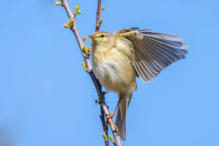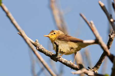 Melodious Warbler (Hippolais polyglotta) on a branch against blue sky