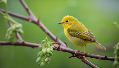 A yellow warbler is perching on a branch of a tree.