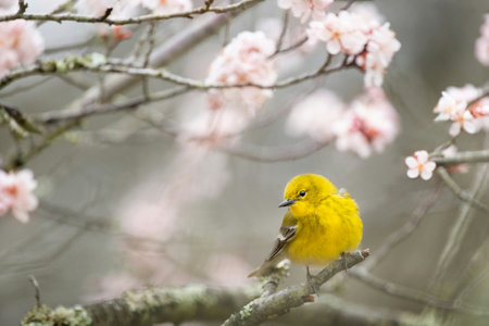 Yellow warbler perched in flowering cherry blossom tree