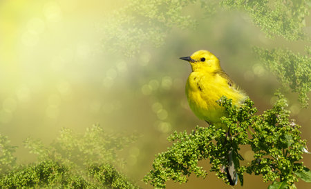 Beautiful yellow willow warbler perching on branch in summertime with blurred green background