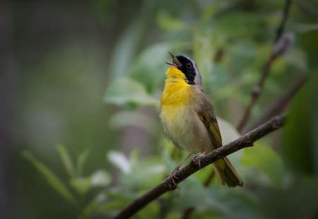 Common Yellowthroat singing on tree branch in forest