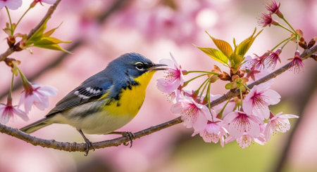 Northern Parula bird perched amidst pink cherry blossoms branches