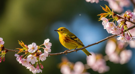 A yellow bird perched on a branch surrounded by pink cherry blossoms